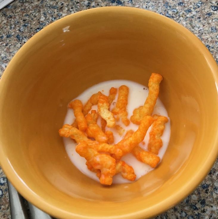 Last – and least – is a so-called new cereal idea: Cheetos and milk. The thought of it was like taking medicine. When we took our first bite we had a second of insanity thinking it may not be too bad, but the longer the Cheetos sat in the milk the more we went back to our first impulse. That is definitely not replacing our Cinnamon Toast Crunch!