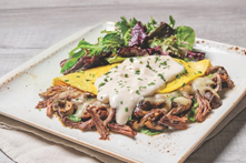 We both love breakfast, but the omelet has not been up there as a favorite option. So, we thought for O month we would sample a few made at restaurants in case we just weren’t being creative enough ourselves and were missing something. The first two omelets we tried were First Watch’s “The Bacado” (bacon, artichoke, and Monterey Jack) and their seasonal “Short Rib Omelet.” This one was described as: “Savory red wine–braised beef short ribs, house-roasted shallots and Crimini mushrooms, fresh spinach and Mozzarella cheese. Topped with Parmesan cream sauce and fresh herbs.” The Bacado was not a hit with us as it was very bland but the Short Rib Omelet was super delicious.