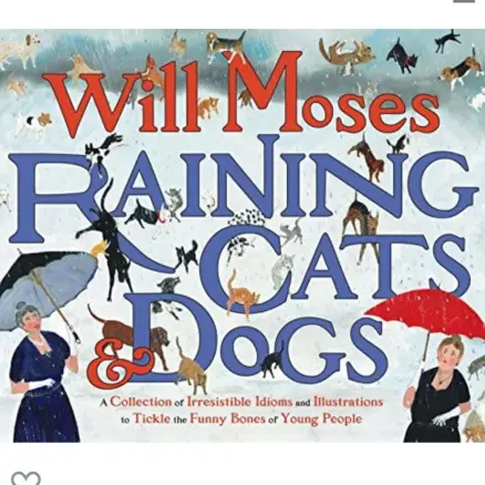 As with most phrases, this one has several different origins, two of which are the most often cited. The first explanation claims roots in Norse mythology, where cats symbolized heavy rains and dogs were associated with Odin, the god of storms. The second version originated in 16th century England, where houses had thatched roofs and served as one of the few places where animals hid to get warm. Sometimes, when it would start to rain heavily, roofs would get slippery, and cats and dogs would fall off. Thus, if someone were looking, it would appear that it was raining cats and dogs. There is even an illustration in the previously-unheard-of-by-me- but-now-I-must-read children’s book: Raining Cats and Dogs: A Collection of Irresistible Idioms and Illustrations to Tickle the Funny Bones of Young People by Will Moses.