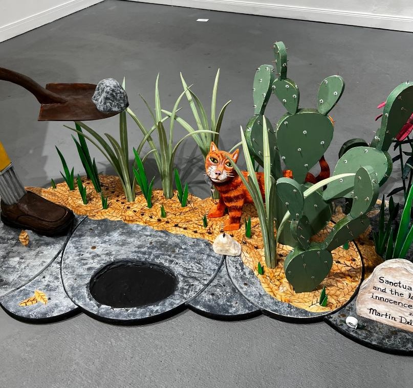 We’ve been to the Studio Movie Grill in Richardson many times but never knew that there was a wonderful place on the street just behind the theatre called Goldmark Cultural Center. They were highlighting this 3-dimensional exhibit by Martin Delabano which presents two figures in a garden. From the description online: “Martin’s work pulls the spectator in and soon: remarkable details of humor and whimsy bring us into this conversation easily and in joy, we belong to this sanctuary for as long as we are willing to be there…. Find the unexpected: the work that watches you; the repurposed dowel, a box for your memories. In every work there is a vessel, literally or figuratively for us to place that which we need to place there. Perhaps it is joy, sadness, longing or surprise: whatever emotion, it and you are welcome here. Stay a while. “