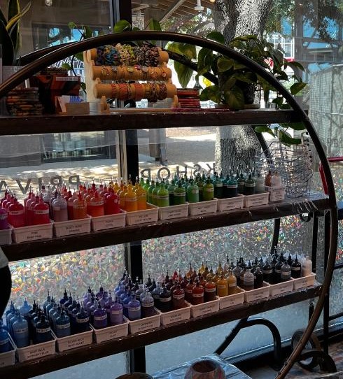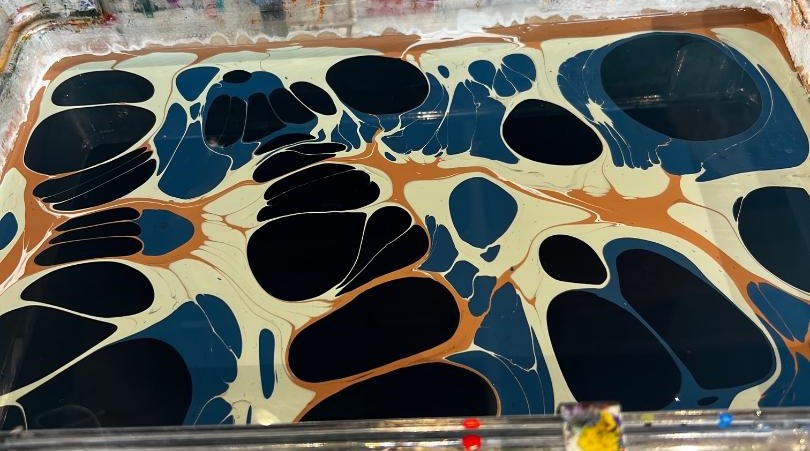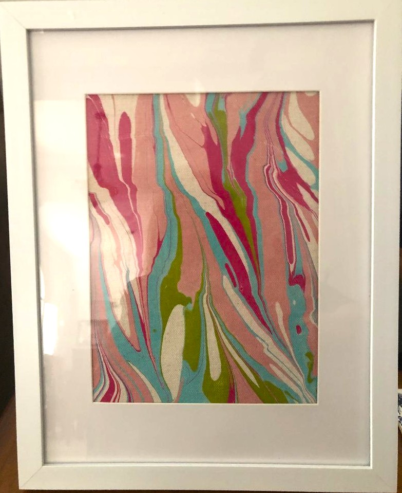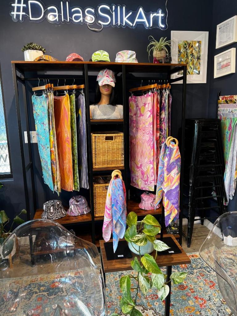 Marble art is a newfound experience for us but one we totally enjoyed at Dallas Silk Art at Grandscape in The Colony. It’s almost a foolproof art form! Every pattern will be interesting, and you pick up to six colors of your choice – and then let your creative side take charge! Marble art is an ancient art form, dating back to the 1100’s in either Turkey or Persia, but obviously the Dallas Silk Art studio offers a modern day setting and materials.
