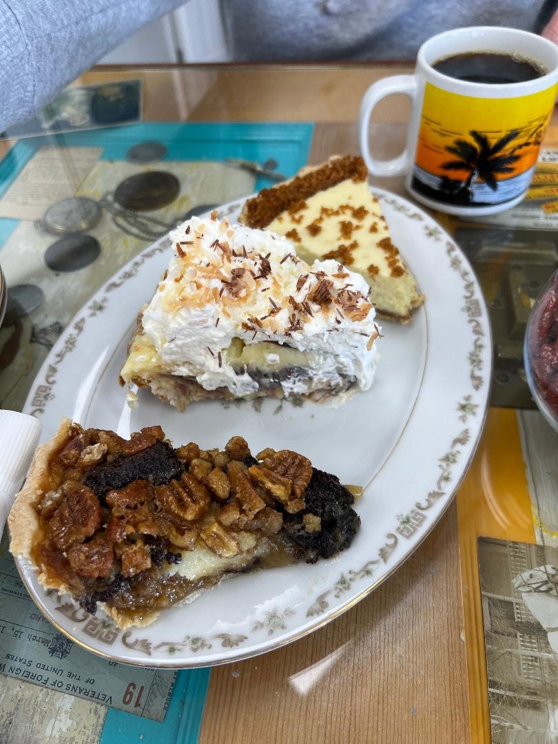 One can purchase a pie or a slice or a quarter and split it or they even offer “Pie Flights” with your choice of 3 slices. And if you want a whole pie but forgot to order one, they will allow you to select 4 quarters and they will create a Build-A-Pie for you. Even if this place turns out to be a bust, just their fun with names and offerings was enticing enough to have made a visit. We ordered the Pie Flight of Best of Both Worlds (a combination of chocolate cream and coconut cream pies), Oops (chunks of chocolate and pecan with bourbon) and the Key Lime pie.
