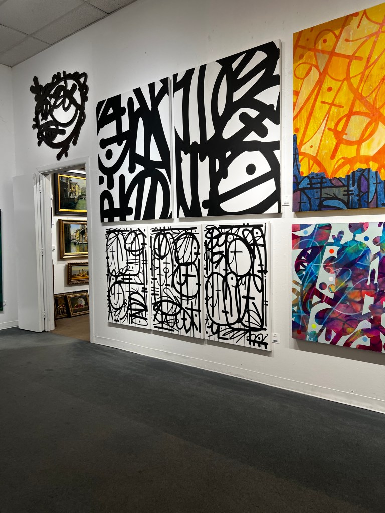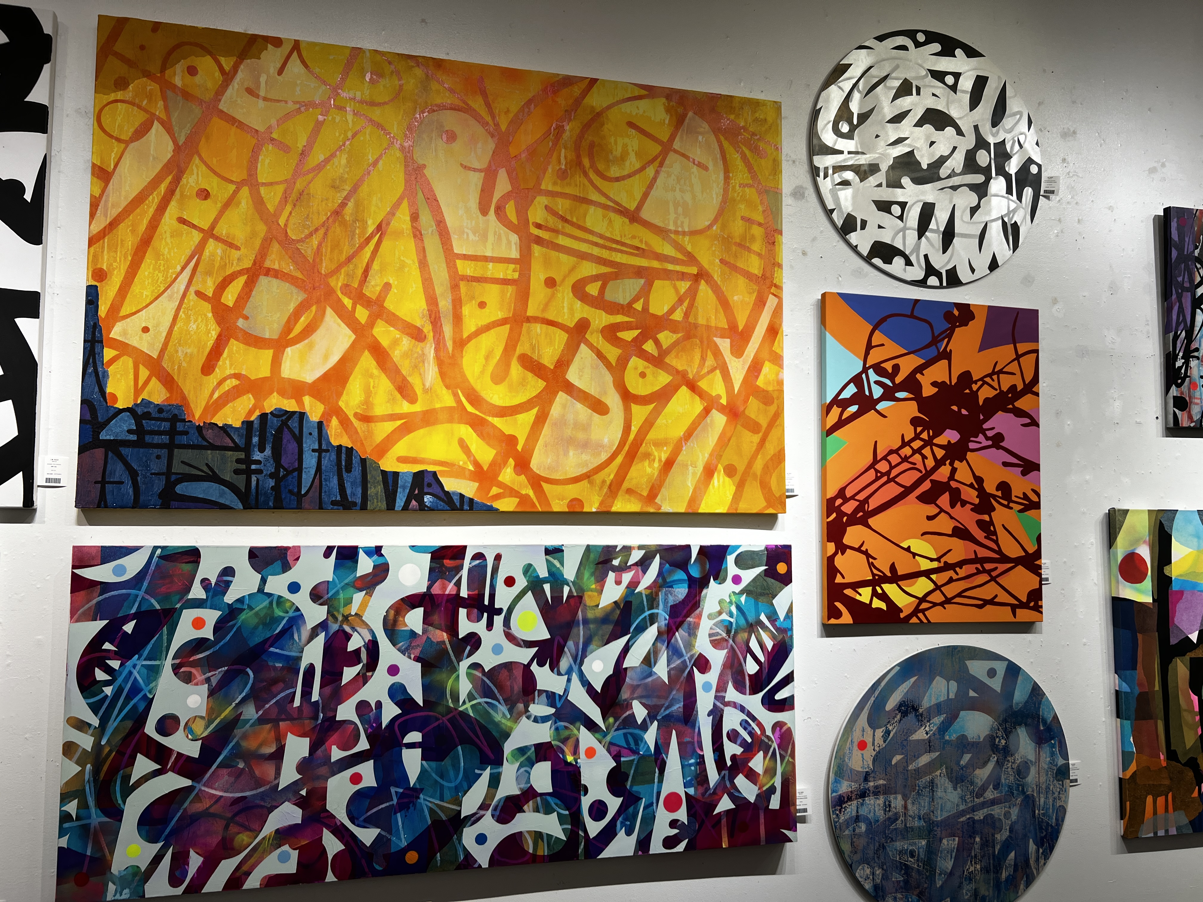 Rizzi was born in Brooklyn so perhaps that is why we really loved his paintings with their vibrant colors and swirls. Laura’s favorite was the orange background picture between the two round ones entitled “Terra Cotta Silhouette” and Barbara’s the black and white triptych called “3 The Hard Way.”