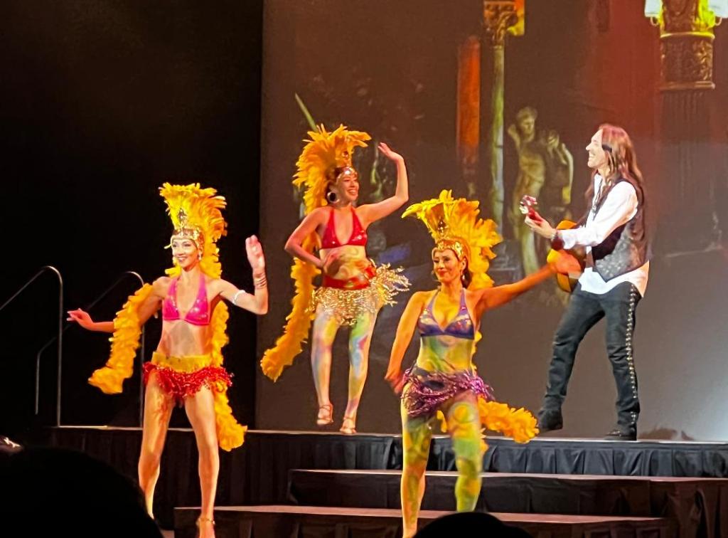 When we heard that the Eisemann Theater was presenting a performance of Spanish guitar music and dance, we knew we had to get tickets. After all, it’s “S” month, plus we always enjoy live music events. We were not disappointed. Roni Benisek, best known as Benise, is an American guitarist who has gained a wide following for his shows and the beautiful music, fascinating dancers and staging that enhance the origins of each performance. Plus, the show – “Benise: Fiesta” – was unique in that it included classic songs from such legends as Led Zeppelin, The Eagles and AC/DC and fused them with Spanish guitar and dance. We were treated to music from Spain, Mexico, Cuba and Brazil, often accompanied by African drumming and either flamenco, salsa or samba dancers with gorgeous, swirling dresses. It was truly a feast for one’s eyes and ears and we were very glad we went.