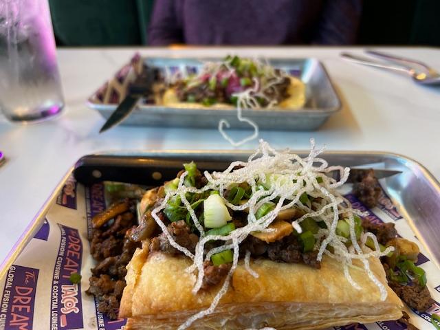 When we go to sleep, we occasionally have dreams. But not about TACOS. However, The Dream Tacos restaurant could soon make an appearance. Their tacos are definitely dream worthy! Chef Chetra is the talent behind the taste, as he has created global fusion tacos from the cuisines of France, Japan, southern BBQ, southern East Asia and Mexico. Barbara had the Beef Wellington Taco and Laura took the recommendation from our waiter who said enthusiastically that the Bulgogi Korean Marinated Taco is his favorite. Both tacos were reasonably priced and truly delicious. Plus, the decor was delightful and added a special touch to a great tasting experience.