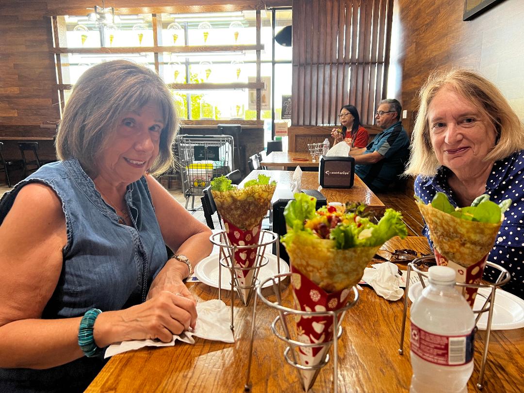 Continuing the week with something different, we went to a Japanese crepe restaurant that features both sweet and savory crepes. There are 44 locations across the United States but this was our first visit. Our friend Kathy joined us and we decided we would each have a savory crepe and then follow with a sweet one. We didn’t realize how filling the crepes would be so a sweet one will just have to wait for another visit. What makes this place special is that the crepes are made with 100% gluten-free rice flour batter and the ingredients are creatively arranged into the crispy crepe like an ice cream cone – typifying the gobble on the go trend. We can vouch for the tastiness of the Chicken Teriyaki, the Okinawa Hot Dog and the Thai Chicken crepe. Overall the food was quite good, but the new experience of eating a crepe this way with these flavors made it a delightful outing.