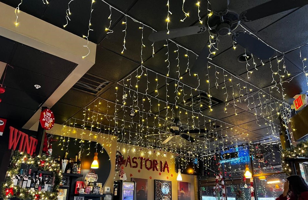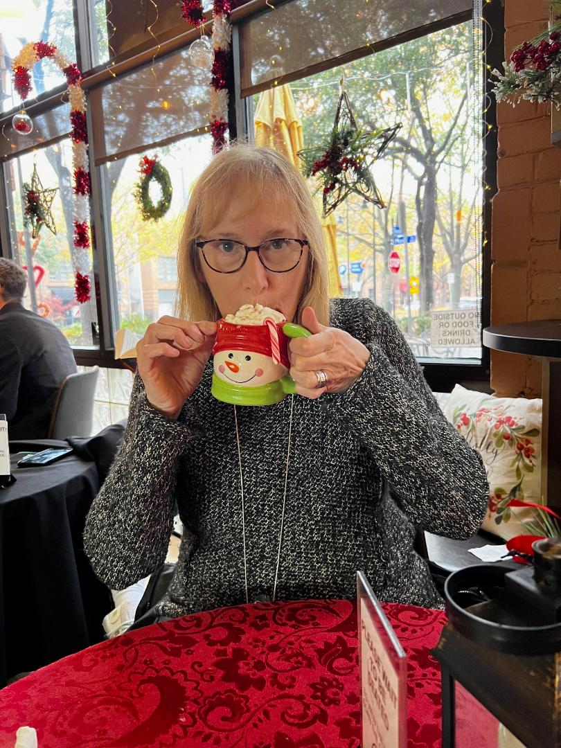 The first place we chose was Astoria Café and Wine Bar in Addison. This was a cute little place, reminiscent of some of the independent cafés we saw in California, rather than a chain like “someplace” we all know. They did up the place for the winter, so it was quite cozy. The hot chocolate we tried was the Peppermint Hot Chocolate. We both enjoyed it although it was Laura’s second favorite and Barbara’s least favorite. It had a nice chocolaty flavor, but Barbara was disappointed that the only hint of peppermint was in the small candy cane they served it with.