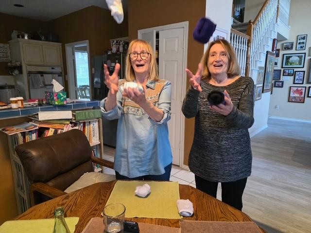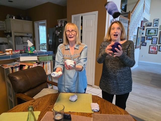 We’ve often wondered how those jugglers do it. Barbara can barely catch one ball, let alone keep three in the air constantly in motion. But how hard could it be? VERY, as we found out. Armed with 3 rolled up sock balls each, we found a good beginners’ video and started to juggle. Between trying to keep the balls in the air and laughing, you could easily say we got an F-. But we definitely had fun. Plus, we learned a few fun facts about juggling: